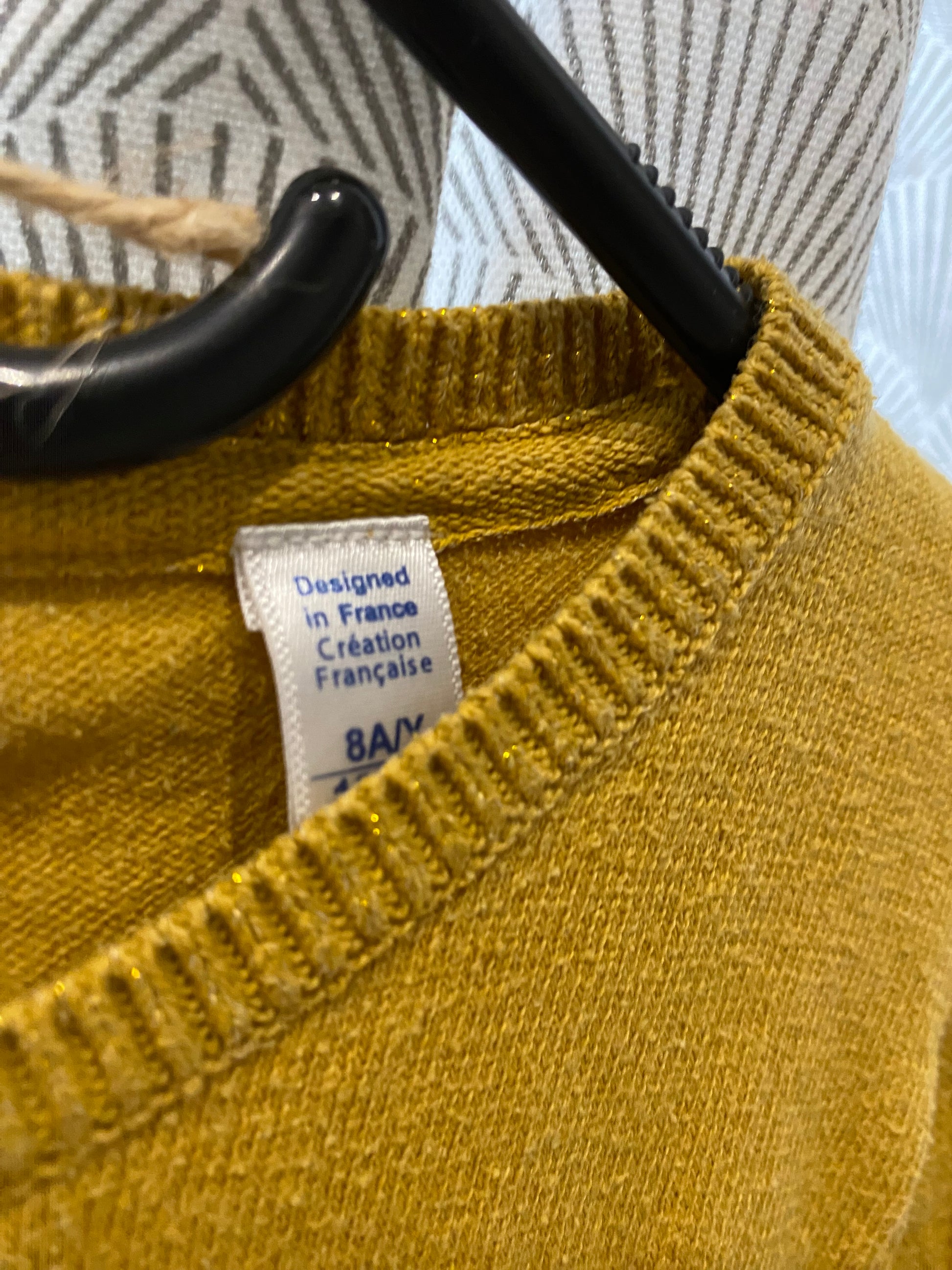 🧶 Gilet basique couleur moutarde avec jolies coutures à paillettes.