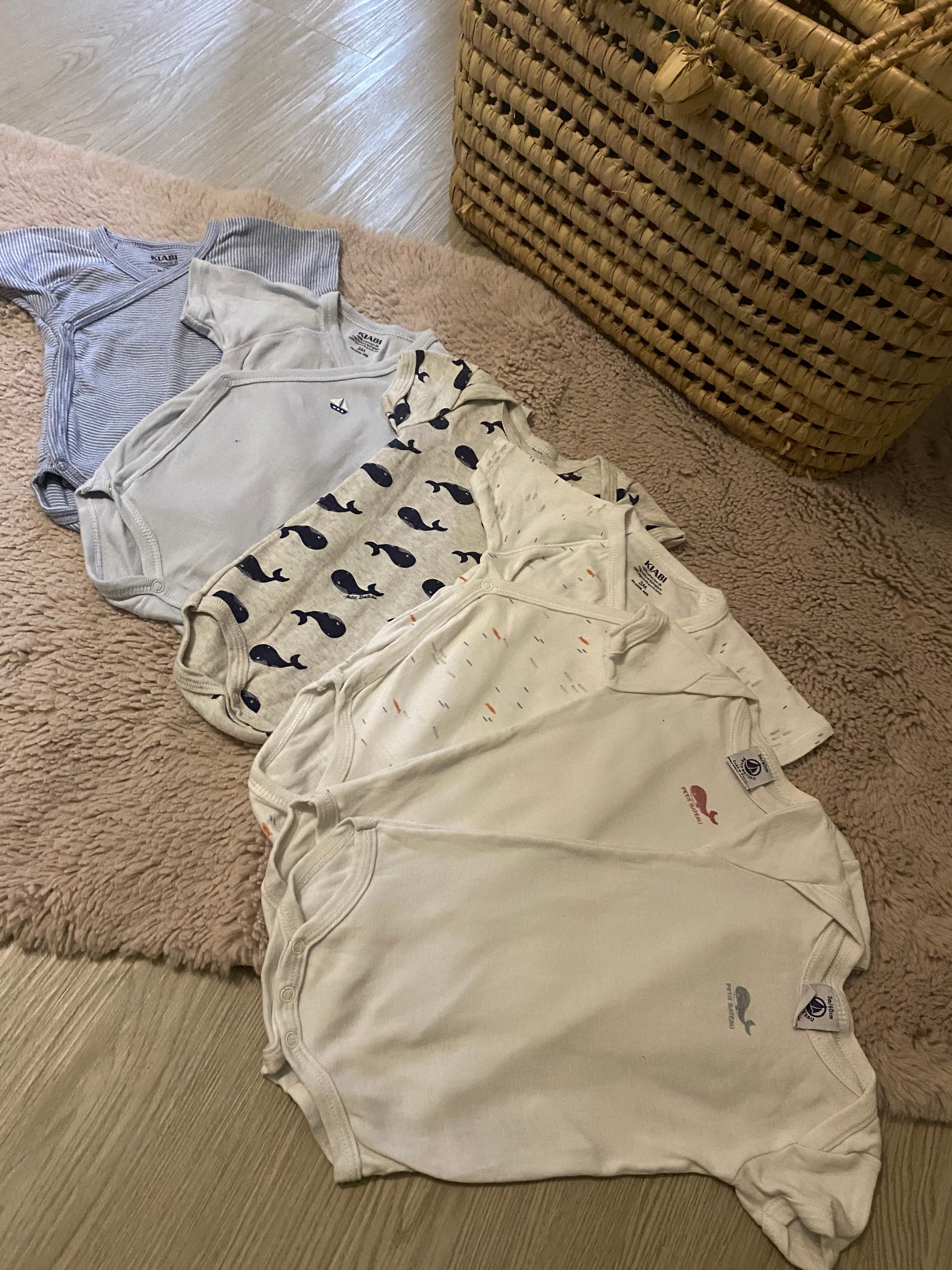 Lot 6 bodies manches courtes motif baleine – Petit Bateau & Kiabi – 3 mois